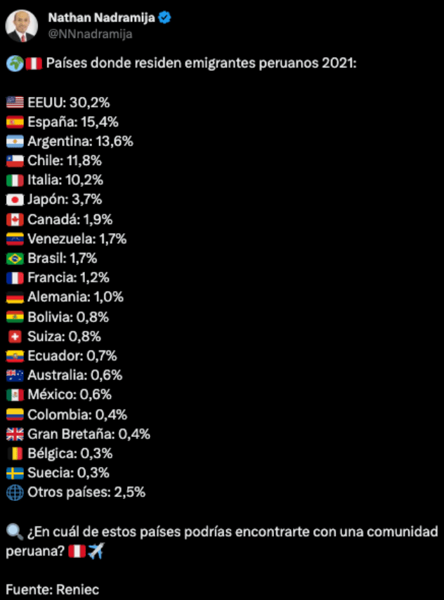 Otro dato que me desmotiva: Según datos de Migraciones – El 2021 hubo 110,185 peruanos migrantes, el 2022 sumamos 401,740, a Junio 2023 llegamos a 415,393. Al cierre del 2023 se proyectan a más de 1 millón de peruanos. ¿A dónde están migrando? Según los datos disponibles