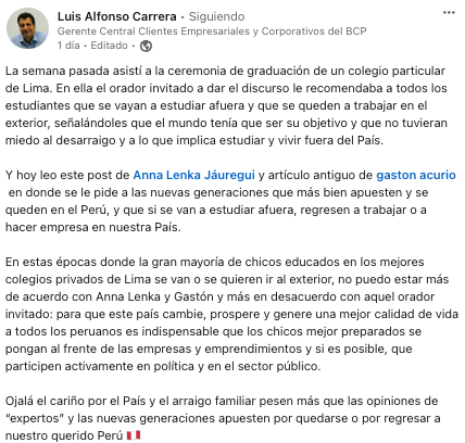 El fin de semana vi un post en Linkedin de un banquero del BCP donde comentaba que los peruanos debíamos de remar por el beneficio del Perú y revertir esta tendencia de migración que estaba ocurriendo. Me dio nostalgia. Mas aun porque citaba a otra colega del BCP quien a su vez citaba al discurso de Gaston Acurio en la Universidad del Pacifico en el 2006 (fue quizas una de los primeros sucesos virales y se reenvian por cadenas de emails), donde hablaban de la importancia de imaginar empresas globales y la expansión de la comida peruana. Era un momento único pues se estaba gestando el inicio del crecimiento económico que el Peru tuvo hasta el 2014 – 2015, luego se estancó y lo seguimos viviendo hasta hoy (casi 10 años después).