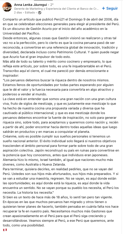 Discurso de Gaston Acurio por la inaguración del Año Academico de la Universidad del Pacifico, Marzo 2006. Te arranca una lágrima leerlo 20 meses después: https://www.ersilias.com/discurso-en-la-universidad-del-pacifico-pronunciado-por-gaston-acurio/?srsltid=AfmBOopzQhIbfAaXiXZmOieeWEBNJtVJmZWNAoqNr-bSUwGQA0xWiTv7